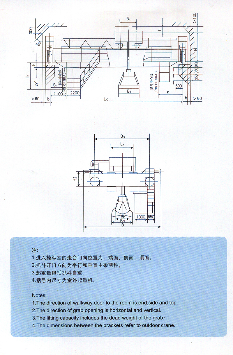 2、抓斗开门方向为平行和垂直主梁两种。