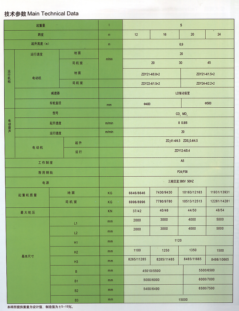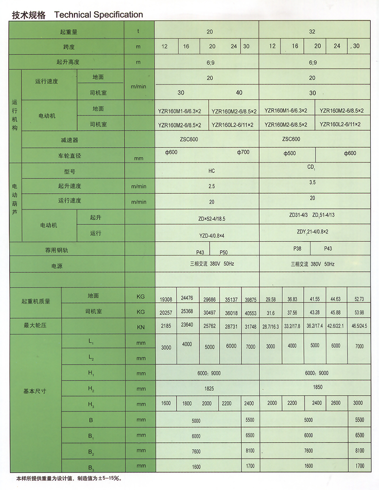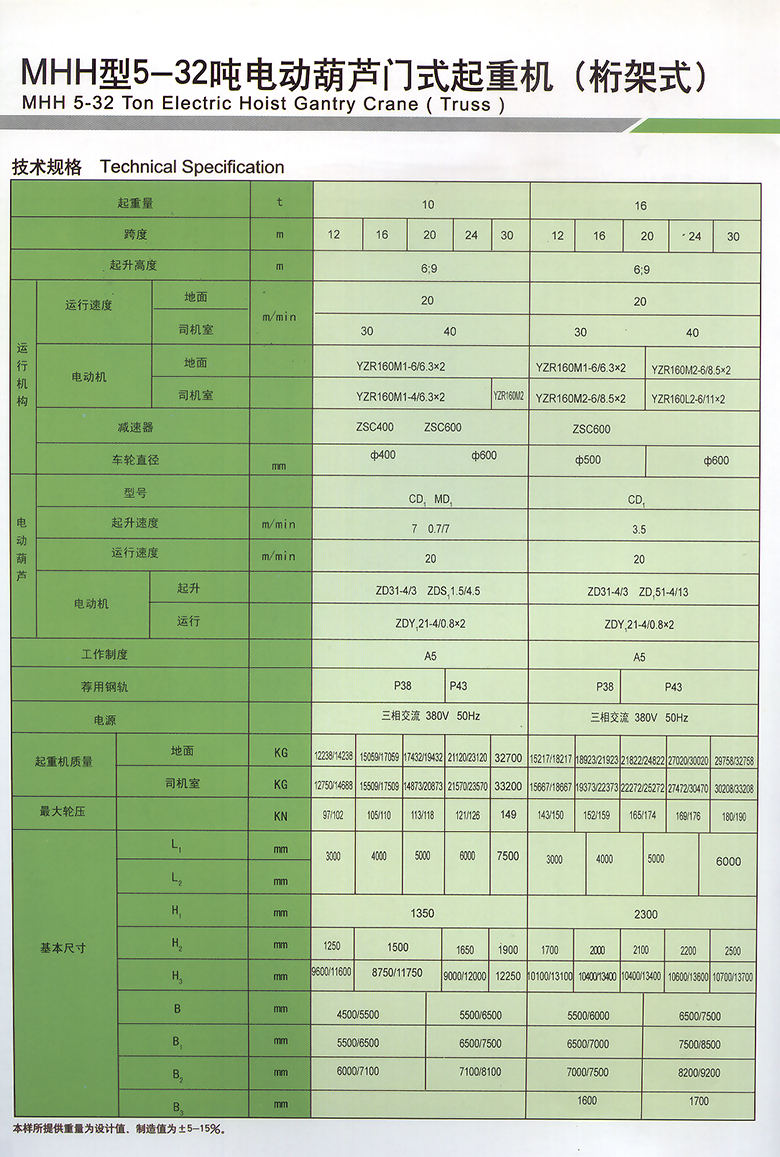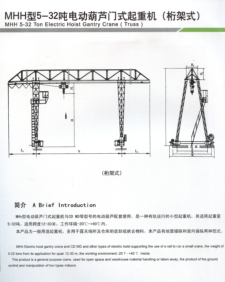 MHh型电动葫芦门式起重机与CD、MD、HC等型号的电动葫芦配套使用,是一种有轨运行的小型起重机。其适用起重量5-32吨,适用跨度为12-30米,工作环境-20℃~40℃内。