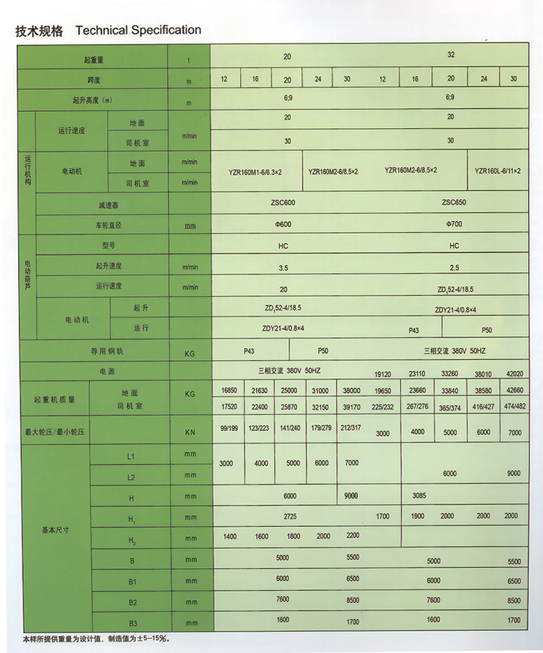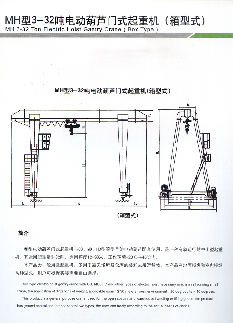 MH型电动葫芦门式起重机与CD、MD、HC等型号的电动葫芦配套使用,是一种有轨运行的中小型起重机。其适用起重量3-32吨,适用跨度为12-30米,工作环境-20℃~40℃内。
