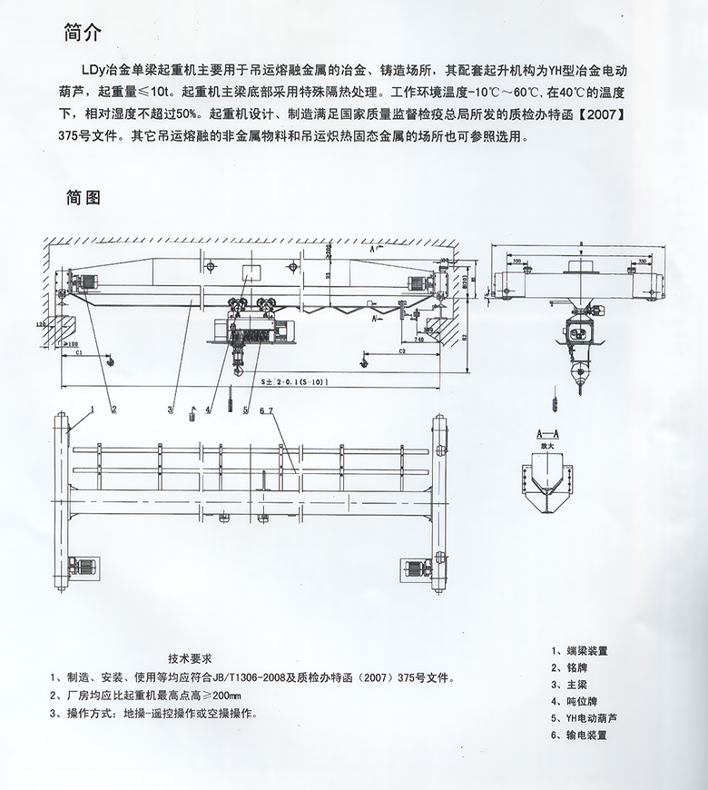 LDY-型冶金电动单梁起重机 (以下简称起重机) 是按 JB/T1306-2008 标准且符合质检办特[375]号文件设计的与 YHII 型电动葫芦配套使用的空间运输工具,主要作用是以间歇、周期的工作方式,通过起重吊钩或其它取物装置及时、迅速地完成冶金生产过程中所需起吊运输重物的位移,是现代工业企业中冶金和 铸造场所提高劳动生产率的重要工具和设备。
